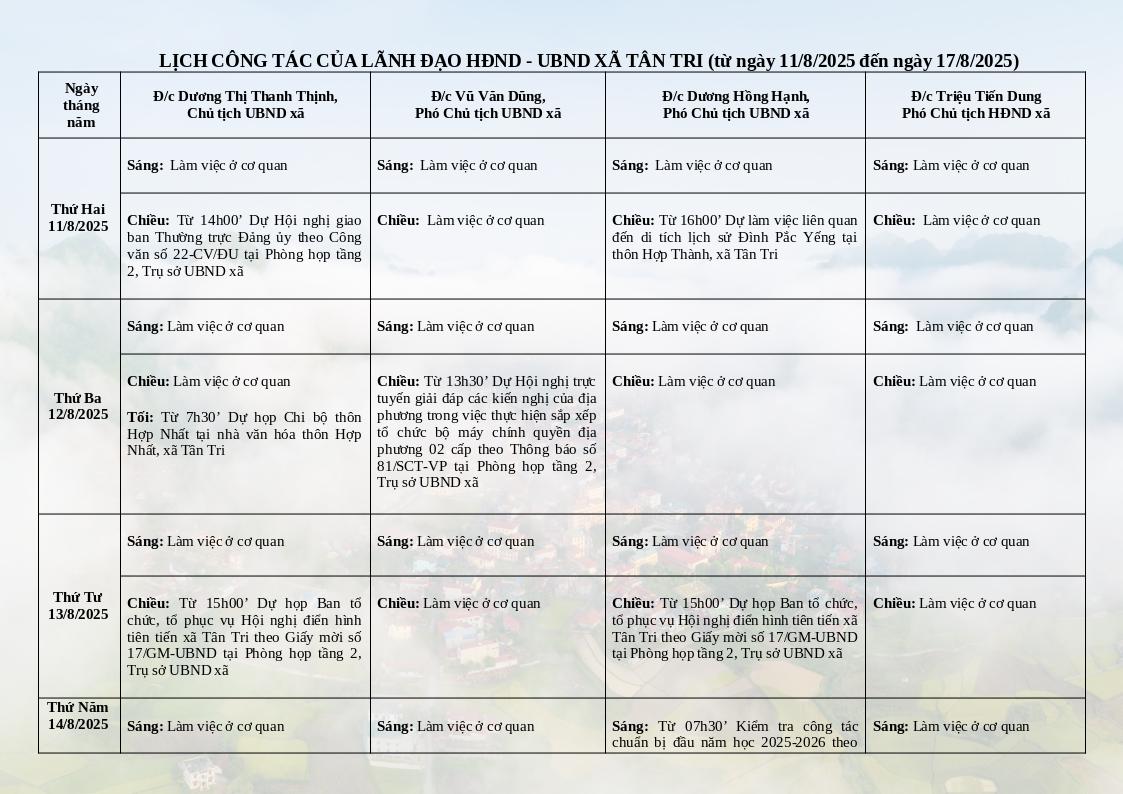 | Tiêu đề văn bản | Lịch công tác tuần của Lãnh đạo HĐND và UBND xã Tân Tri (từ thứ Hai ngày 11/8/2025 đến Chủ nhật ngày 17/8/2025) | ||