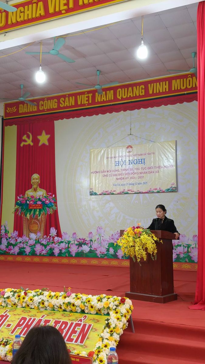 Thực hiện các quy định của Luật Bầu cử đại biểu Quốc hội và đại biểu Hội đồng nhân dân; các văn bản chỉ đạo, hướng dẫn của Ủy ban Trung ương Mặt trận Tổ quốc Việt Nam về công tác hiệp thương, giới thiệu người ứng cử đại biểu HĐND các cấp, sáng ngày 23/12/2025, Ủy ban Mặt trận Tổ quốc Việt Nam xã Tân Tri đã tổ chức Hội nghị hướng dẫn nội dung, trình tự, thủ tục giới thiệu người ứng cử đại biểu Hội đồng nhân dân xã nhiệm kỳ 2026–2031.