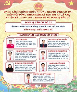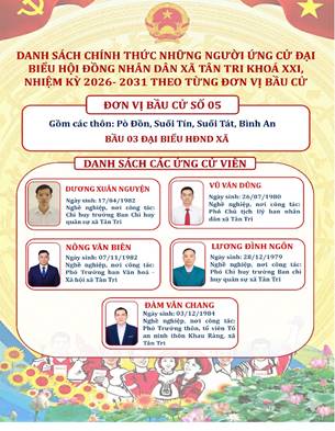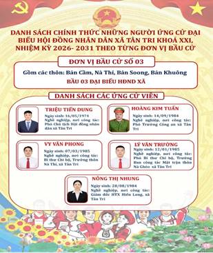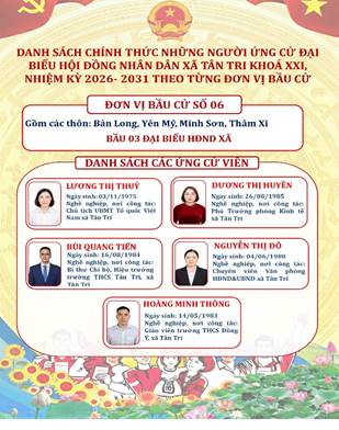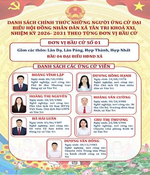Ngày hội toàn dân đang cận kề, mỗi cử tri xã Tân Tri hãy phát huy cao độ quyền làm chủ, chủ động dành thời gian nghiên cứu kỹ lưỡng tiểu sử và năng lực thực tiễn của từng ứng cử viên. Với sự lựa chọn công tâm, sáng suốt, mỗi lá phiếu của cử tri sẽ là nền tảng quan trọng góp phần xây dựng bộ máy chính quyền hành động, gần dân và vì dân./.