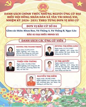 Kỳ bầu cử Đại biểu Hội đồng nhân dân xã Tân Tri khóa XXI, nhiệm kỳ 2026-2031 đang đến gần, mang theo kỳ vọng lớn lao về một chặng đường phát triển đột phá. Danh sách ứng cử viên chính thức tại 6 đơn vị bầu cử vừa được niêm yết không chỉ thể hiện tính dân chủ, minh bạch mà còn cho thấy tầm nhìn nhân sự chiến lược của địa phương.