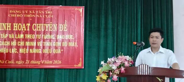 Chiều ngày 21/4/2026, Đảng ủy xã Tân Tri tổ chức sinh hoạt chi bộ mẫu tại Chi bộ thôn Nà Cuối. Dự hội nghị có đồng chí Lê Thị Nga – Bí thư Đảng ủy, Chủ tịch HĐND xã; đồng chí Hoàng Vĩnh Lập – Phó Bí thư Thường trực Đảng ủy xã; cùng các đồng chí Ủy viên Ban Chấp hành Đảng bộ xã phụ trách, theo dõi chi bộ. Tham dự còn có lãnh đạo, chuyên viên các Ban xây dựng Đảng; các đồng chí Bí thư, Phó Bí thư chi bộ các thôn cùng toàn thể đảng viên Chi bộ thôn Nà Cuối.