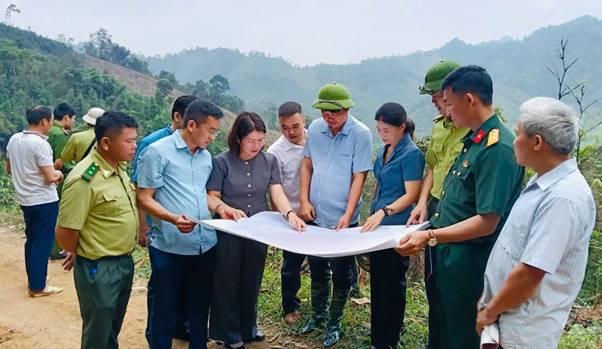 Các đồng chí lãnh đạo xã kiểm tra tại hiện trường giáp ranh giữa thôn Bình An xã Tân Tri, tỉnh Lạng Sơn và Thôn Thượng Lương xã Nghinh Tường, tỉnh Thái Nguyên.
