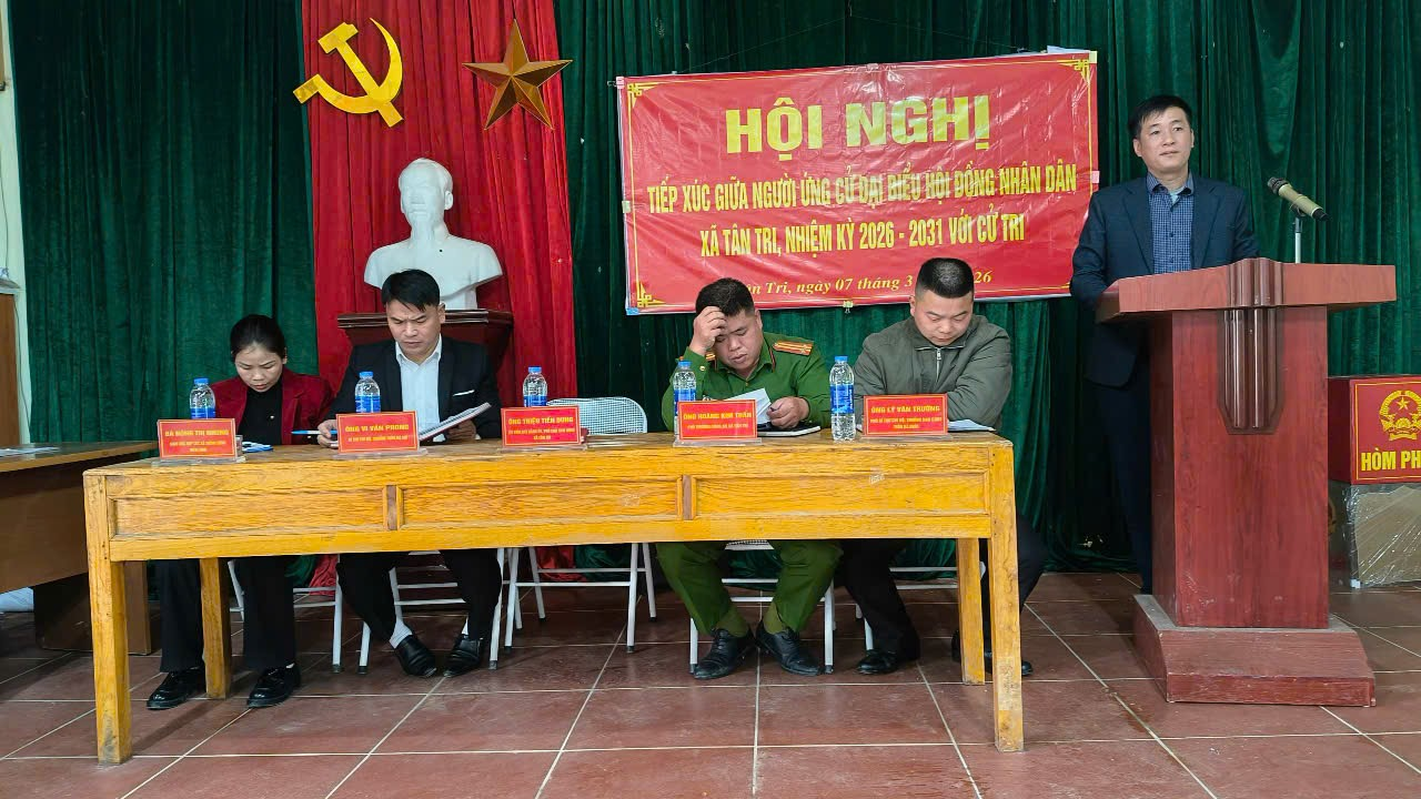 Đơn vị bầu cử số 03 có 05 ứng cử viên đại biểu HĐND xã. Tham gia hội nghị tiếp xúc cử tri vận động bầu cử có ông Triệu Tiến Dung, Ủy viên Ban Thường vụ Đảng ủy, Phó Chủ tịch HĐND xã Tân Tri cùng 04 ứng cử viên đại biểu HĐND xã Tân Tri, nhiệm kỳ 2026–2031.