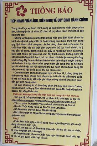 Thực hiện chủ trương của Đảng về đổi mới tổ chức bộ máy hành chính theo mô hình chính quyền địa phương hai cấp, đồng thời cụ thể hóa quy định tại Nghị định số 118/2025/NĐ-CP ngày 09/6/2025 của Chính phủ về thực hiện thủ tục hành chính theo cơ chế một cửa, một cửa liên thông tại Bộ phận Một cửa và Cổng Dịch vụ công quốc gia, UBND xã Tân Tri đã chính thức thành lập và đưa vào hoạt động Trung tâm Phục vụ hành chính công từ ngày 01/7/2025.