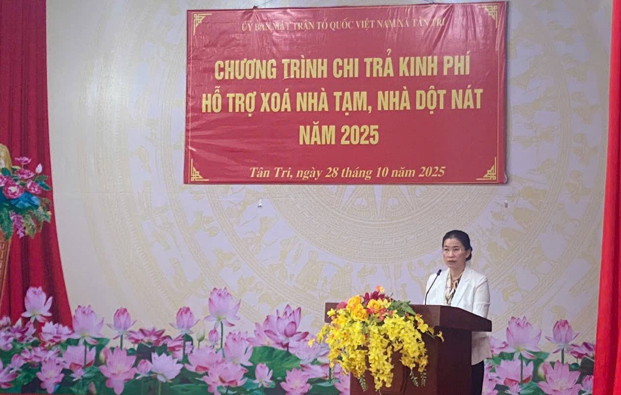 Phát biểu tại chương trình, bà Lê Thị Nga - Bí thư Đảng ủy, Chủ tịch HĐND xã nhấn mạnh: “Chương trình xóa nhà tạm, nhà dột nát là hoạt động mang ý nghĩa nhân văn sâu sắc, thể hiện sự quan tâm của Đảng, Nhà nước và chính quyền địa phương đối với đời sống Nhân dân. Đây cũng là minh chứng cho tinh thần đoàn kết, tương thân tương ái trong cộng đồng – không để ai bị bỏ lại phía sau.” Trong thời gian qua, Ủy ban MTTQ Việt Nam xã Tân Tri đã chủ động phối hợp với UBND xã và các ban, ngành, đoàn thể địa phương tiến hành rà soát, tổng hợp nhu cầu hỗ trợ, lập danh sách và hồ sơ trình cấp trên xem xét, phê duyệt. Quá trình triển khai được thực hiện công khai – minh bạch – đúng đối tượng – đúng mục đích, đảm bảo mọi nguồn lực hỗ trợ đến tay người dân kịp thời, hiệu quả.