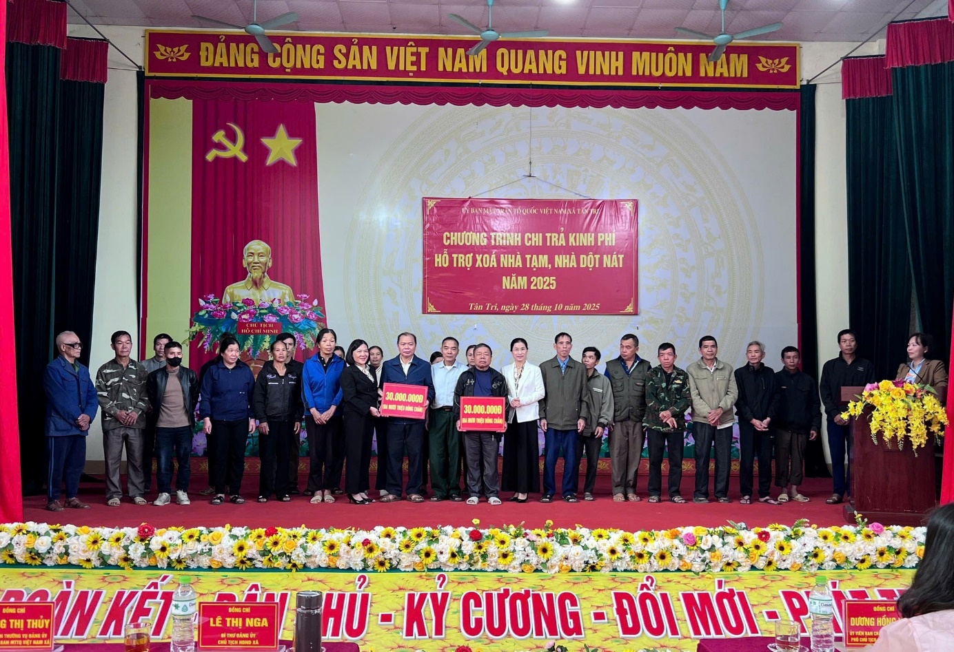 Sáng ngày 28/10/2025 tại Nhà văn hóa xã, Ủy ban Mặt trận Tổ quốc Việt Nam xã Tân Tri tổ chức chương trình chi trả kinh phí hỗ trợ xóa nhà tạm, nhà dột nát năm 2025 cho 45 hộ dân thuộc diện hộ bị ảnh hưởng bởi thiên tai, biến đổi khí hậu và các đối tượng khó khăn về nhà ở trên địa bàn xã, với tổng kinh phí hỗ trợ 1.980.000.000 đồng.