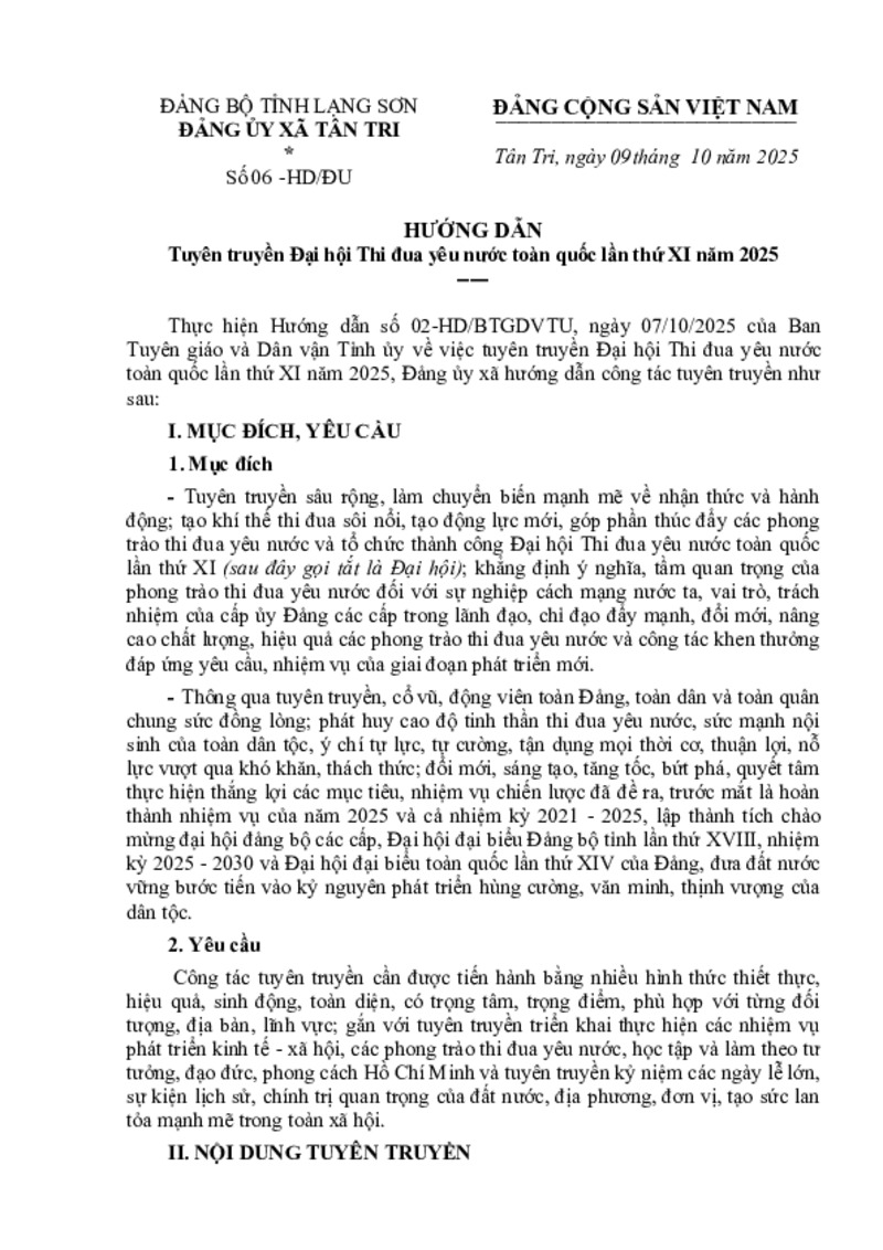 | Tiêu đề văn bản | HƯỚNG DẪN Tuyên truyền Đại hội Thi đua yêu nước toàn quốc lần thứ XI năm 2025 | ||