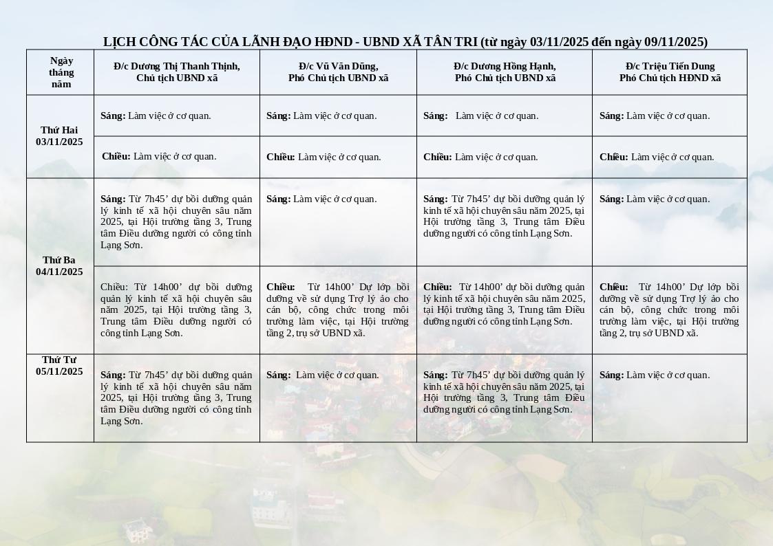 | Tiêu đề văn bản | LỊCH CÔNG TÁC CỦA LÃNH ĐẠO HĐND - UBND XÃ TÂN TRI (từ ngày 03/11/2025 đến ngày 09/11/2025) | ||