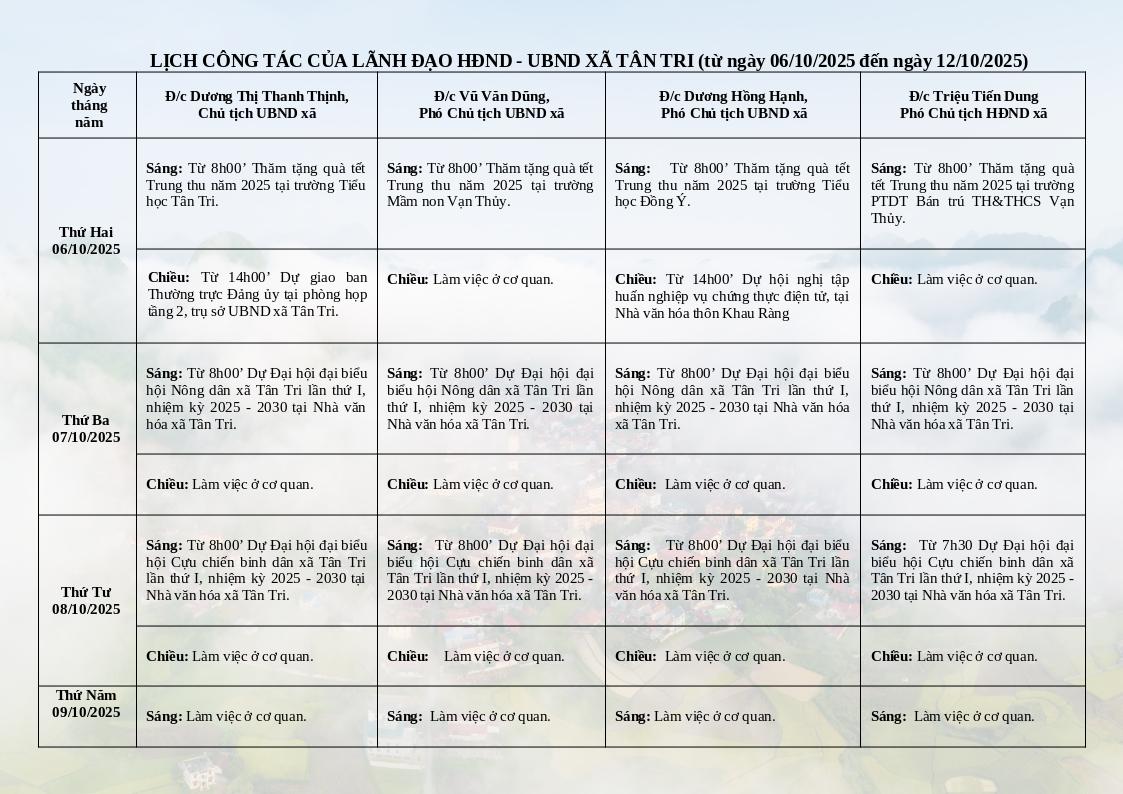 | Tiêu đề văn bản | LỊCH CÔNG TÁC CỦA LÃNH ĐẠO HĐND - UBND XÃ TÂN TRI (từ ngày 06/10/2025 đến ngày 12/10/2025) | ||