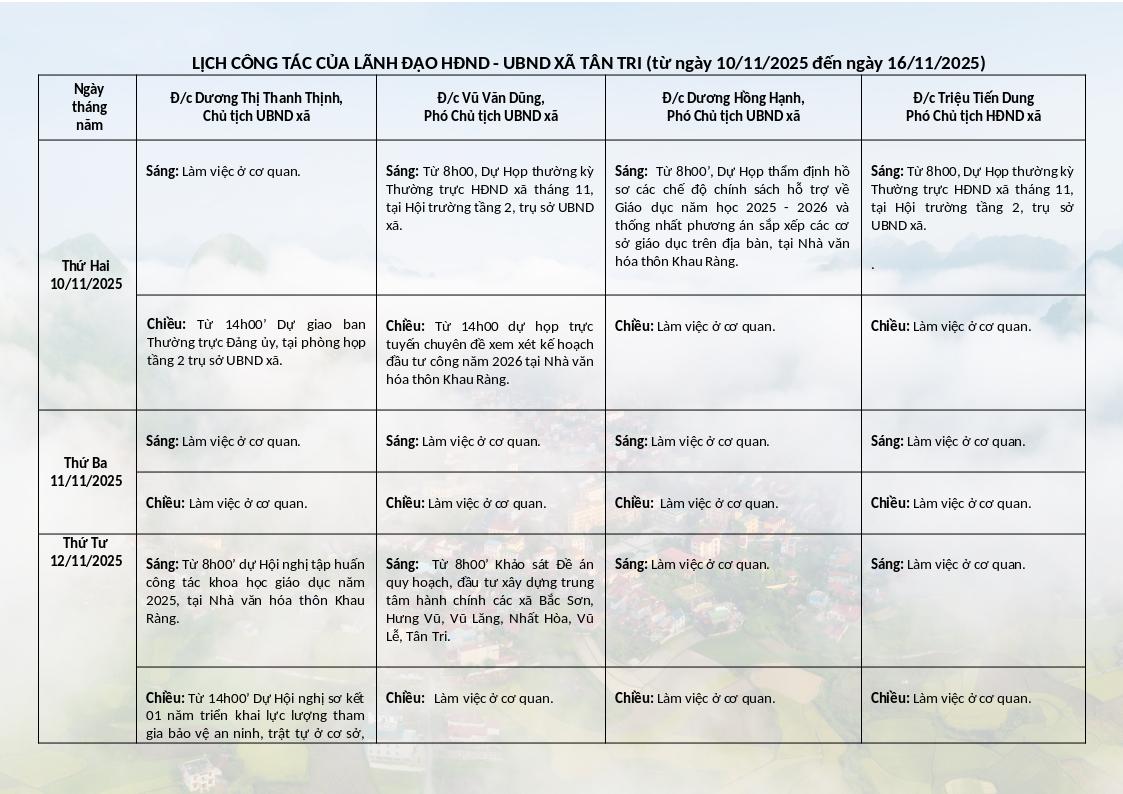 | Tiêu đề văn bản | LỊCH CÔNG TÁC CỦA LÃNH ĐẠO HĐND - UBND XÃ TÂN TRI (từ ngày 10/11/2025 đến ngày 16/11/2025) | ||