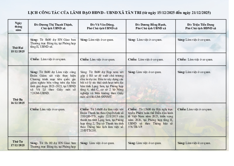 | Tiêu đề văn bản | LỊCH CÔNG TÁC CỦA LÃNH ĐẠO HĐND - UBND XÃ TÂN TRI (từ ngày 15/12/2025 đến ngày 21/12/2025) | ||