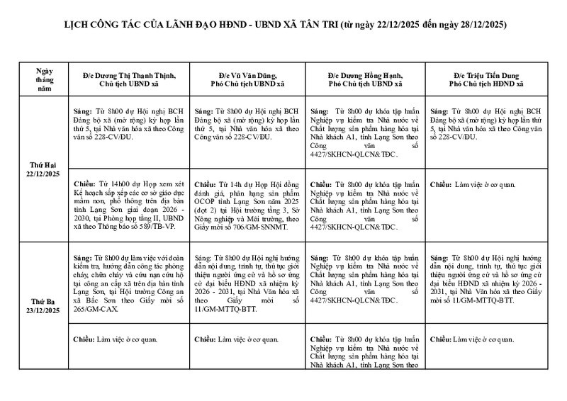 | Tiêu đề văn bản | LỊCH CÔNG TÁC CỦA LÃNH ĐẠO HĐND - UBND XÃ TÂN TRI (từ ngày 22/12/2025 đến ngày 28/12/2025) | ||