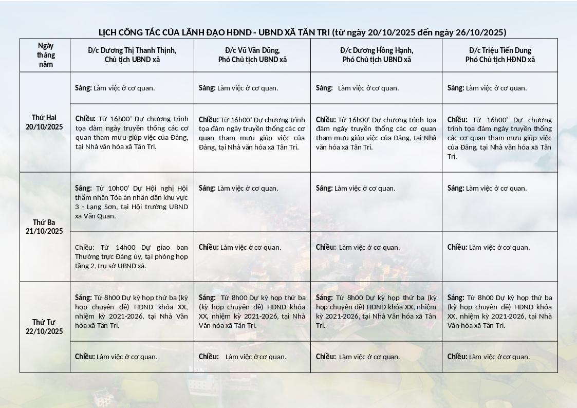 | Tiêu đề văn bản | LỊCH CÔNG TÁC CỦA LÃNH ĐẠO HĐND - UBND XÃ TÂN TRI (từ ngày 27/10/2025 đến ngày 02/11/2025) | ||