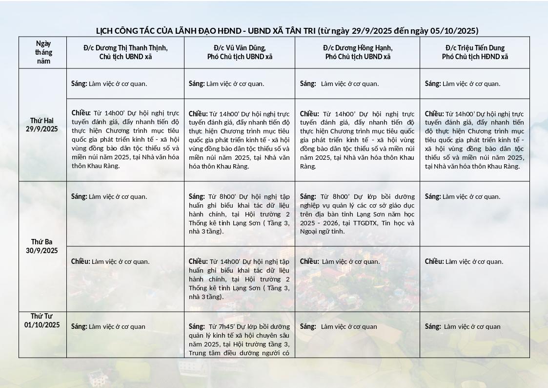 | Tiêu đề văn bản | LỊCH CÔNG TÁC CỦA LÃNH ĐẠO HĐND - UBND XÃ TÂN TRI (từ ngày 29/9/2025 đến ngày 05/10/2025) | ||