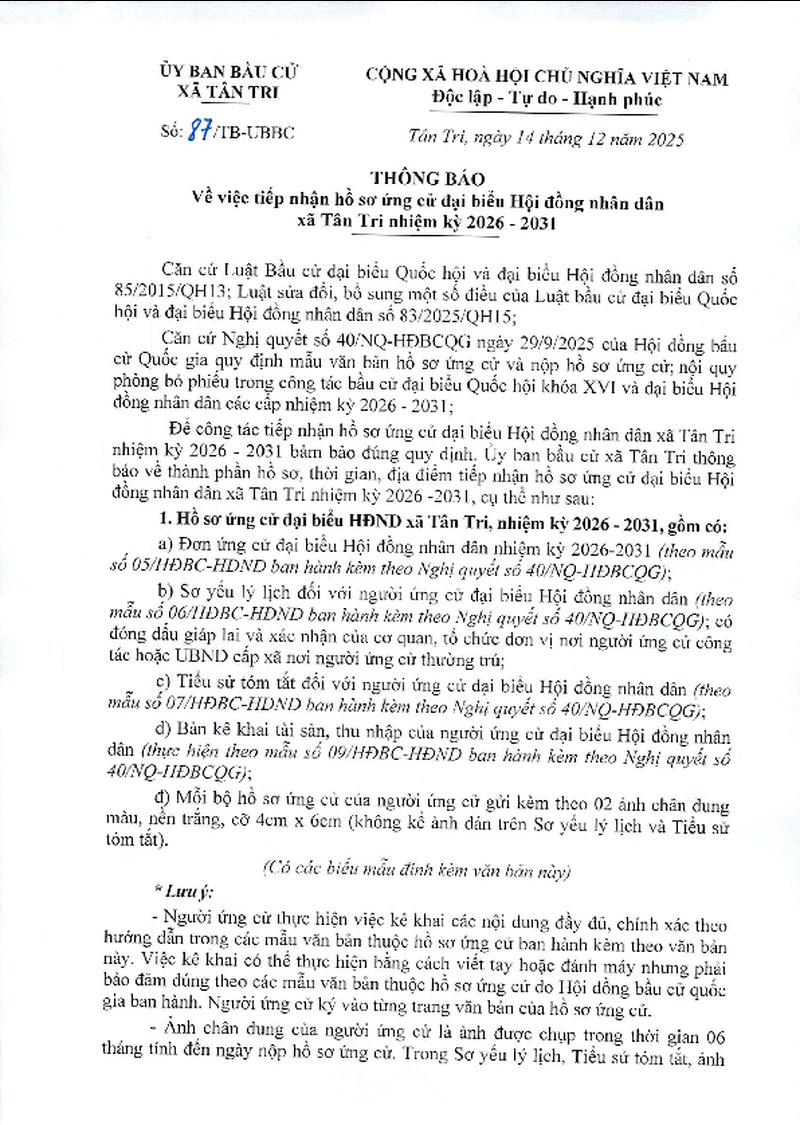 | Tiêu đề văn bản | Thông báo về việc tiếp nhận hồ sơ ứng cử đại biểu HĐND xã Tân Tri, nhiệm kỳ 2026 - 2031. | ||