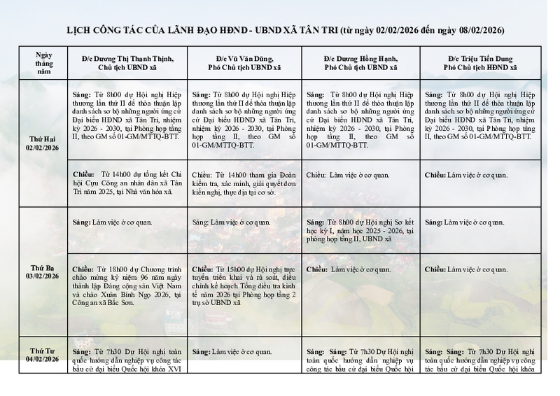 | Tiêu đề văn bản | LỊCH CÔNG TÁC CỦA LÃNH ĐẠO HĐND - UBND XÃ TÂN TRI (từ ngày 02/02/2026 đến ngày 08/02/2026) | ||