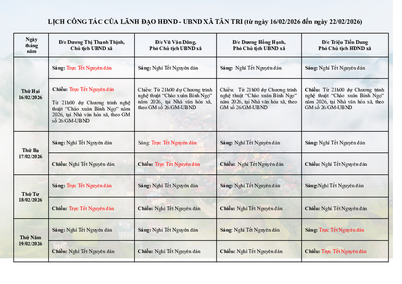 | Tiêu đề văn bản | LỊCH CÔNG TÁC CỦA LÃNH ĐẠO HĐND - UBND XÃ TÂN TRI (từ ngày 16/02/2026 đến ngày 22/02/2026) | ||