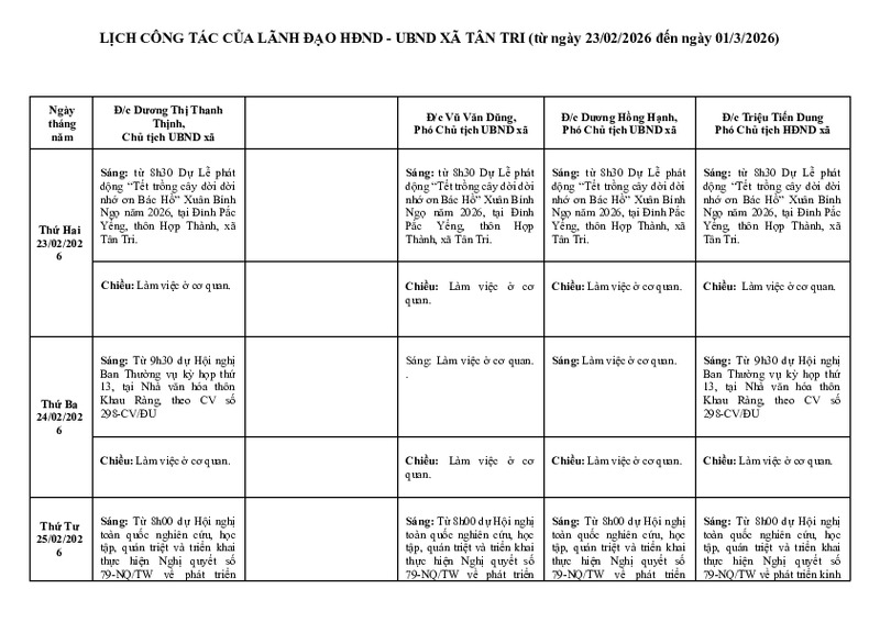 | Tiêu đề văn bản | LỊCH CÔNG TÁC CỦA LÃNH ĐẠO HĐND - UBND XÃ TÂN TRI (từ ngày 23/02/2026 đến ngày 01/3/2026) | ||