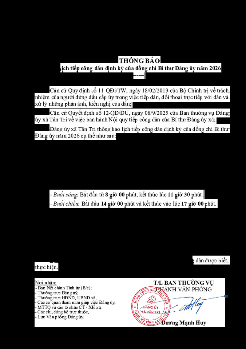 | Tiêu đề văn bản | Thông báo lịch tiếp công dân của Bí thư Đảng ủy năm 2026 | ||