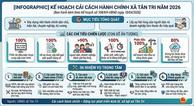 Ngày 10/4/2026, UBND xã Tân Tri ban hành Kế hoạch số 108/KH-UBND về cải cách hành chính (CCHC) năm 2026, nhằm triển khai đồng bộ các nhiệm vụ theo chỉ đạo của Chính phủ, của tỉnh và phù hợp với tình hình thực tiễn địa phương.