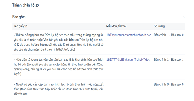 Sau đó nhấn chọn TTHC cần tìm hiểu, màn hình sẽ hiện trình tự thực hiện, thành phần hồ sơ của TTHC đó