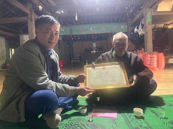 đồng chí Triệu Tiến Dung – Phó Chủ tịch HĐND xã trao quà chúc thọ cho Ông Dương Công Tả (trú tại thôn Vũ Thắng B)