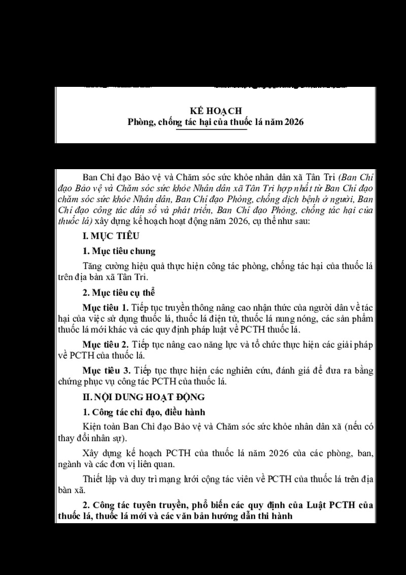 | Tiêu đề văn bản | Kế hoạch Phòng, chống tác hại của thuốc lá năm 2026 | ||